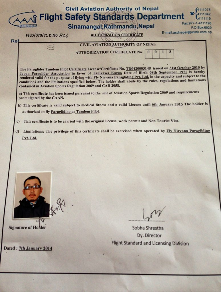ネパール版 商業タンデム 許可証。