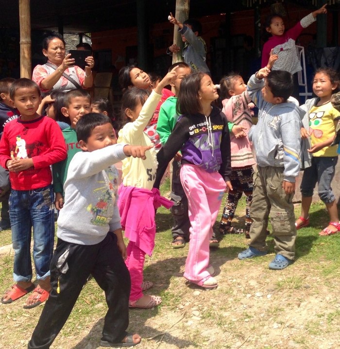 空を飛んでいるパラグライダーを見て、指差すチベタンの子供達…