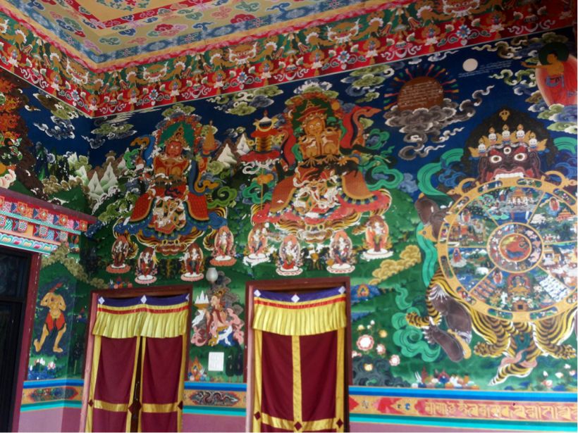 チベット仏教寺の壁画はカラフルで、絵にもひとつひとつ物語りがある様だ。