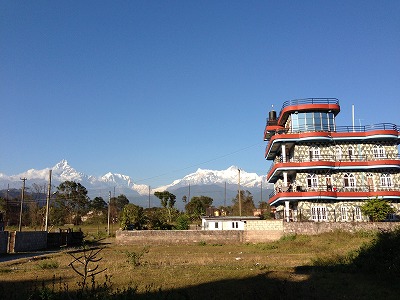 家の前はゴルフ練習場。その後ろにアンナプルナ レンジが広がります。
