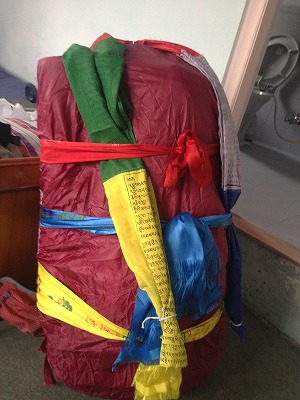 バス、飛行機で移動の時はレインカバーをして、タルチョで縛ってバッグをカバーします。