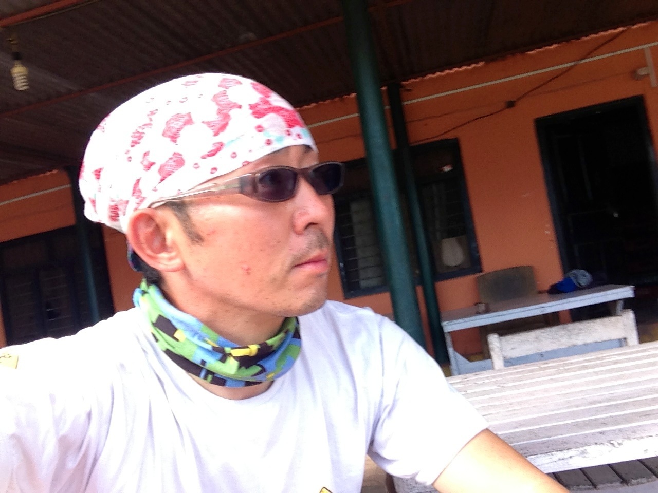 日本ではする事のない、赤いバラ柄のバンダナ。