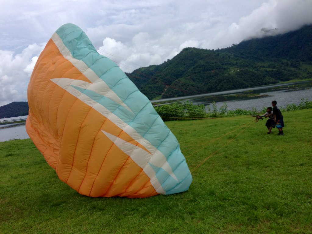 この時 雨の心配はありませんでしたが、風が全くない… 半乾きのグライダーでは立ち上がるのは難しい事は分かっていたので、しっかり立ち上がるまで何度かトライして、お客さんにも精一杯 走ってもらい、テイクオフ ボーイにも引っ張ってもらい、テイクオフする事が出来ました。