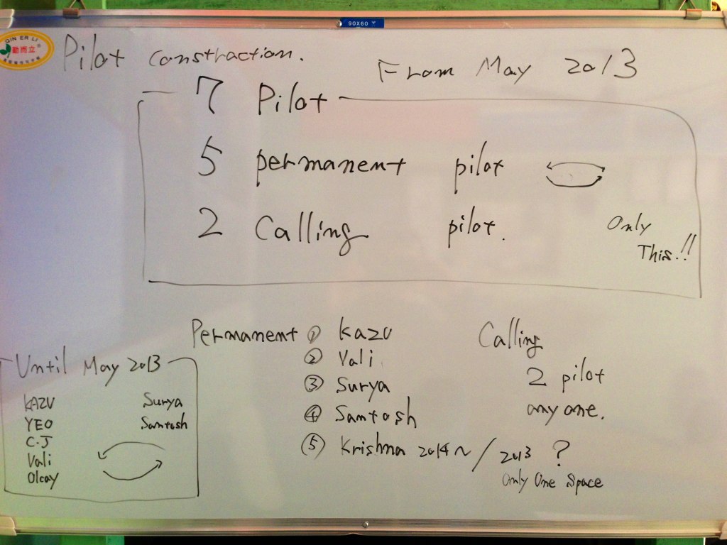 5月からはパーマネント パイロット(一年中働けるパイロット)が5名、Calling パイロット(忙しい時だけ働けるパイロット)が2名、計7名がNirvana のパイロットとして働けます。