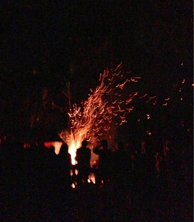 サトウキビを炎の中に入れると、バーンという破裂音と共に火花が飛び散ります。
