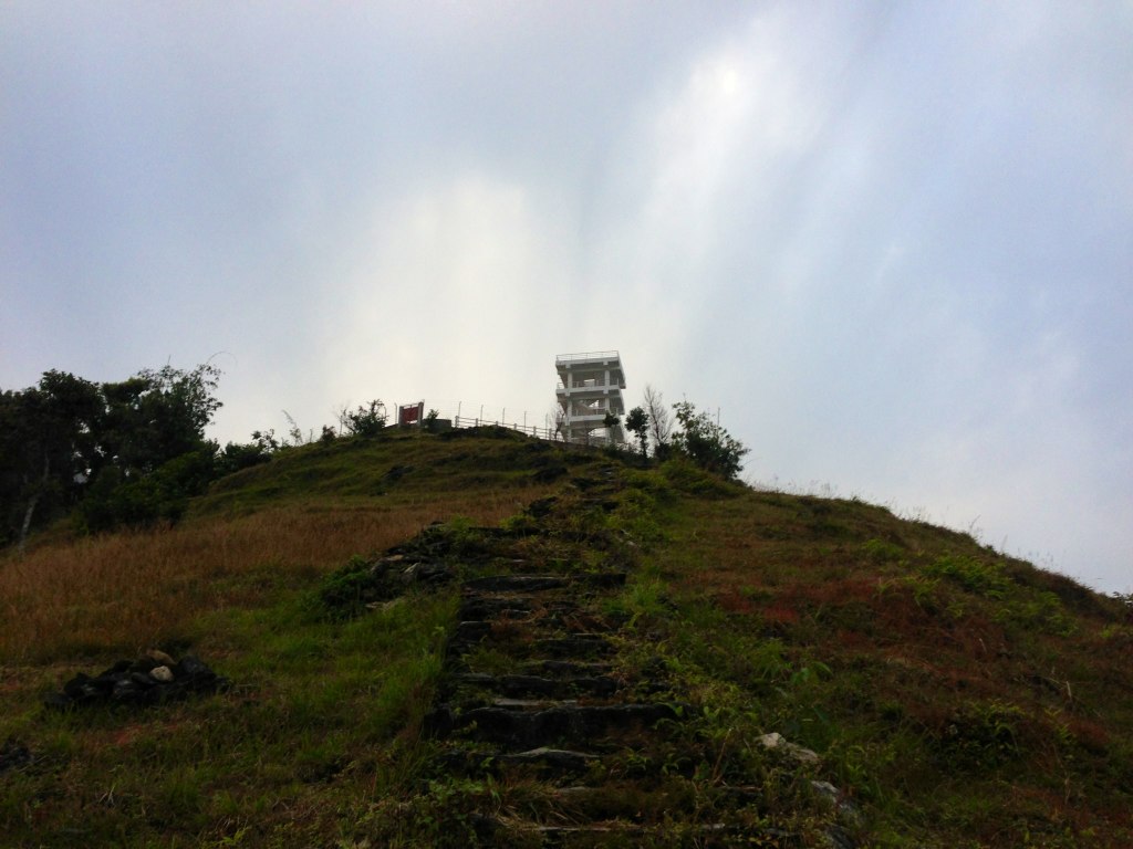 視界のない真っ白な空、山も見えず、雨が降り…