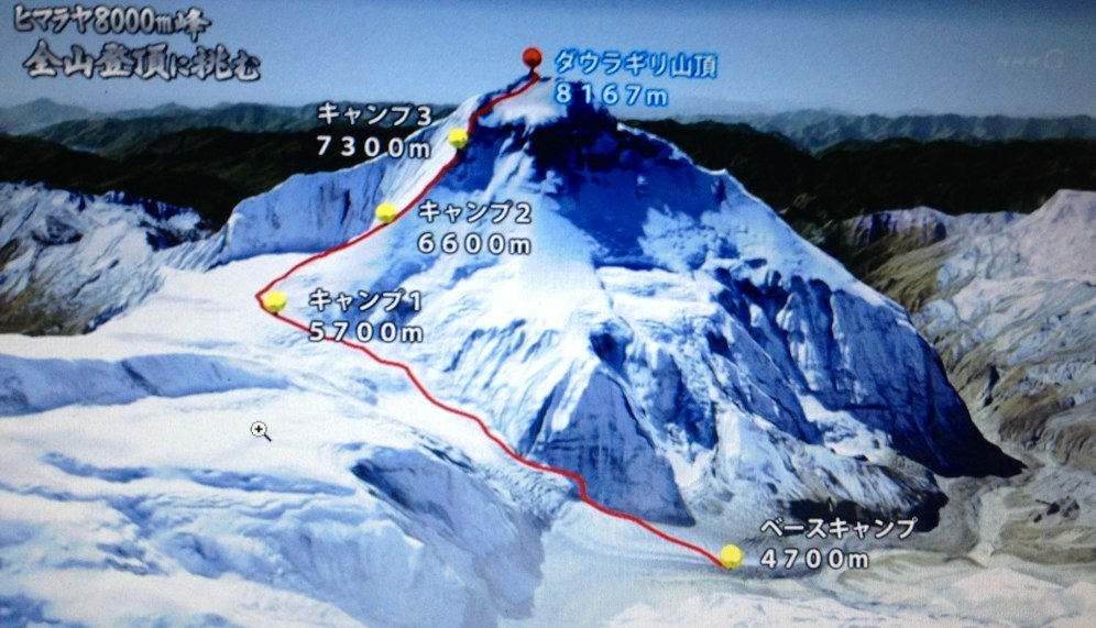 ダウラギリ登頂の一般的なルートだが、北東ルートは雪崩が頻繁に起る地帯を通る為、遭難も多く、竹内が登頂した2012年は僅か7人しか頂に立っていない…